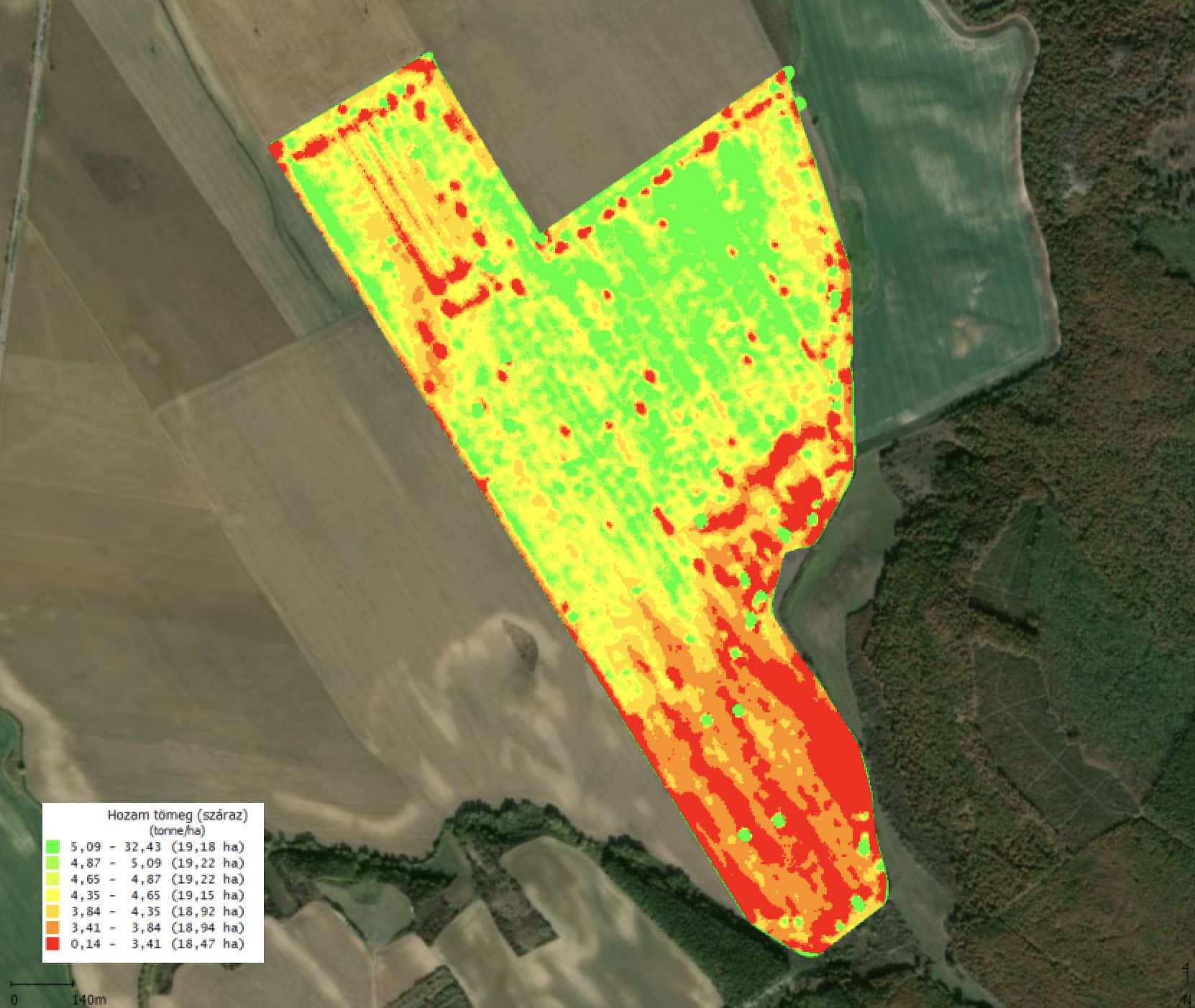 - A tisztított adatokból táblaszinten kezelési zónákat alakítunk ki, figyelembe véve a tengerszint feletti magasságokat, a talajfoltokat, a távérzékelt adatokat és egyéb területi jellegzetességeket.
